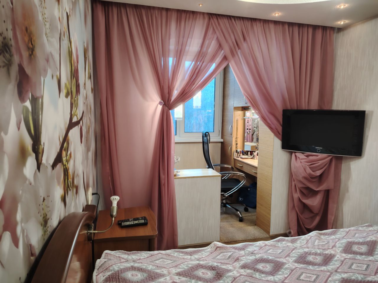 2 спальни изолированные, гостиная смежная с кухней и коридором, в конце коридора кладовка, застеклённый балкон, лоджия утеплённая, объединенная со спальней, в спальне 2-х уровневый потолок, в коридоре и гостиной - натяжные потолки. На окнах стеклопакеты, вход - двойные двери, 1 металлическая.