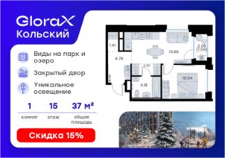 Продается 1-комн. квартира на 15-м этаже в проекте бизнес-класса GloraX Кольский. Общая площадь лота составляет 37,60 кв. м, из которых 10,04 кв. м отведено под жилую и 13,85 кв. м под кухонную зону. Номер квартиры - 179.