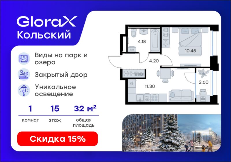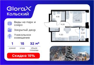 Продается 1-комн. квартира на 15-м этаже в проекте бизнес-класса GloraX Кольский. Общая площадь лота составляет 32,73 кв. м, из которых 10,45 кв. м отведено под жилую и 11,30 кв. м под кухонную зону. Номер квартиры - 180.