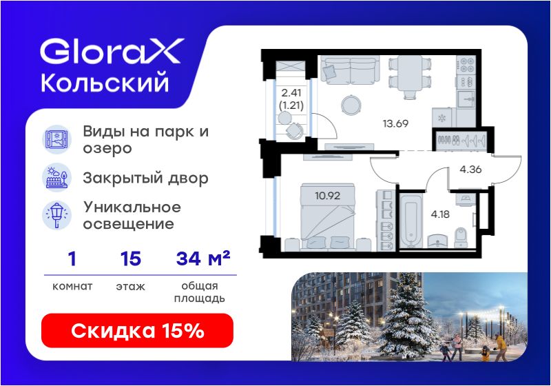 Продается 1-комн. квартира на 15-м этаже в проекте бизнес-класса GloraX Кольский. Общая площадь лота составляет 34,36 кв. м, из которых 10,92 кв. м отведено под жилую и 13,69 кв. м под кухонную зону. Номер квартиры - 177.