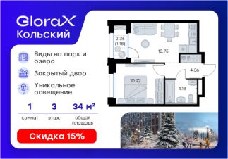 Продается 1-комн. квартира на 3-м этаже в проекте бизнес-класса GloraX Кольский. Общая площадь лота составляет 34,39 кв. м, из которых 10,92 кв. м отведено под жилую и 13,75 кв. м под кухонную зону. Номер квартиры - 21.