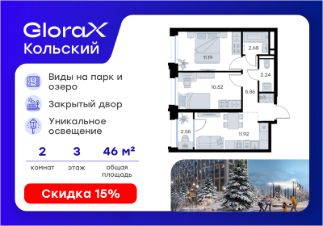 Продается 2-комн. квартира на 3-м этаже в проекте бизнес-класса GloraX Кольский. Общая площадь лота составляет 46,96 кв. м, из которых 21,71 кв. м отведено под жилую и 11,92 кв. м под кухонную зону. Номер квартиры - 22.