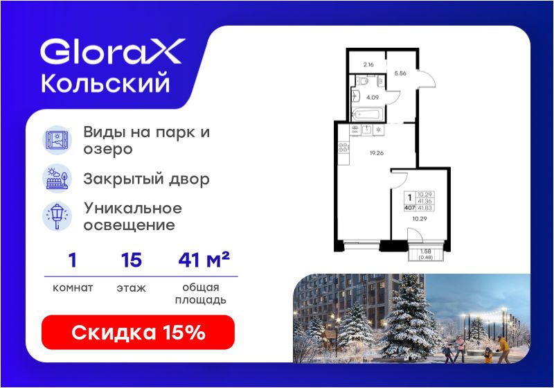 Продается 1-комн. квартира на 15-м этаже в проекте бизнес-класса GloraX Кольский. Общая площадь лота составляет 41,83 кв. м, из которых 10,29 кв. м отведено под жилую и 19,26 кв. м под кухонную зону. Номер квартиры - 407.