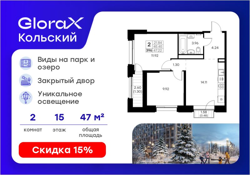 Продается 2-комн. квартира на 15-м этаже в проекте бизнес-класса GloraX Кольский. Общая площадь лота составляет 47,22 кв. м, из которых 21,84 кв. м отведено под жилую и 14,11 кв. м под кухонную зону. Номер квартиры - 396.