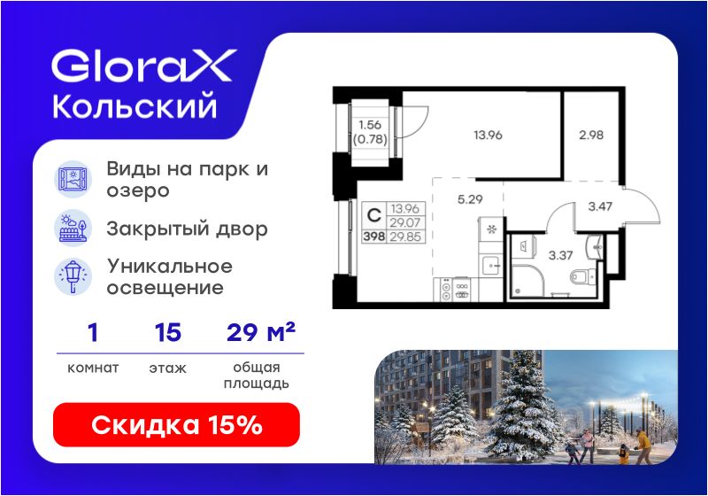 Продается квартира-студия на 15-м этаже в проекте бизнес-класса GloraX Кольский. Общая площадь лота составляет 29,85 кв. м, из которых 13,96 кв. м отведено под жилую и 5,29 кв. м под кухонную зону. Номер квартиры - 398.