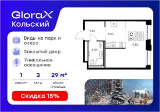 Продается квартира-студия на 3-м этаже в проекте бизнес-класса GloraX Кольский. Общая площадь лота составляет 29,24 кв. м, из которых 14,83 кв. м отведено под жилую и 5,96 кв. м под кухонную зону. Номер квартиры - 261.