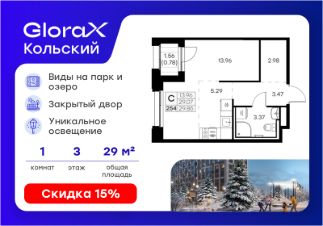 Продается квартира-студия на 3-м этаже в проекте бизнес-класса GloraX Кольский. Общая площадь лота составляет 29,85 кв. м, из которых 13,96 кв. м отведено под жилую и 5,29 кв. м под кухонную зону. Номер квартиры - 254.