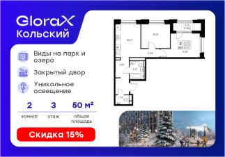 Продается 2-комн. квартира на 3-м этаже в проекте бизнес-класса GloraX Кольский. Общая площадь лота составляет 50,10 кв. м, из которых 21,52 кв. м отведено под жилую и 12,07 кв. м под кухонную зону. Номер квартиры - 257.