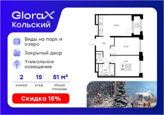 Продается 2-комн. квартира на 15-м этаже в проекте бизнес-класса GloraX Кольский. Общая площадь лота составляет 51,68 кв. м, из которых 22,23 кв. м отведено под жилую и 15,40 кв. м под кухонную зону. Номер квартиры - 727.