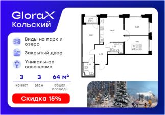 Продается 3-комн. квартира на 3-м этаже в проекте бизнес-класса GloraX Кольский. Общая площадь лота составляет 64,43 кв. м, из которых 35,25 кв. м отведено под жилую и 14,49 кв. м под кухонную зону. Номер квартиры - 618.