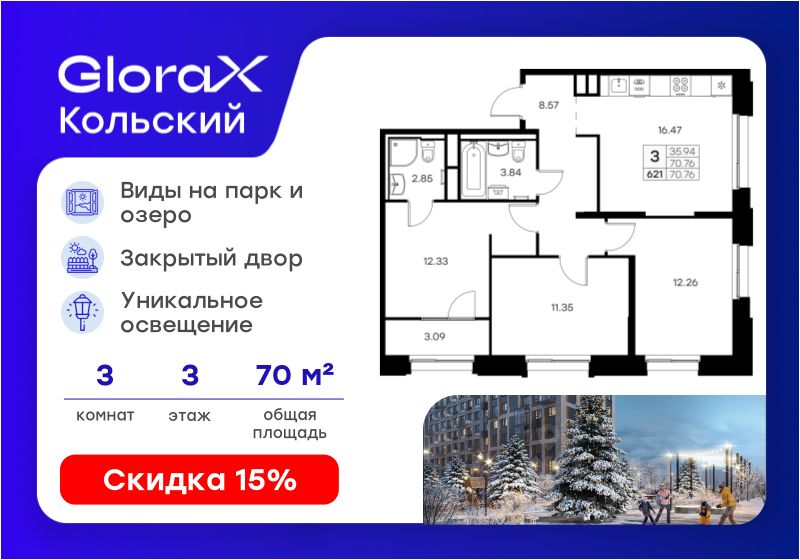 Продается 3-комн. квартира на 3-м этаже в проекте бизнес-класса GloraX Кольский. Общая площадь лота составляет 70,76 кв. м, из которых 35,94 кв. м отведено под жилую и 16,47 кв. м под кухонную зону. Номер квартиры - 621.