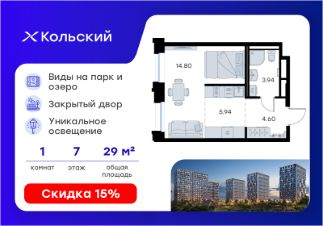 Продается квартира-студия на 7-м этаже в проекте бизнес-класса GloraX Кольский. Общая площадь лота составляет 29,28 кв. м, из которых 14,80 кв. м отведено под жилую и 5,94 кв. м под кухонную зону. Номер квартиры - 72.