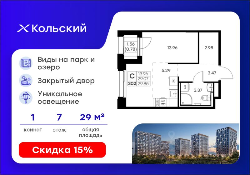 Продается квартира-студия на 7-м этаже в проекте бизнес-класса GloraX Кольский. Общая площадь лота составляет 29,85 кв. м, из которых 13,96 кв. м отведено под жилую и 5,29 кв. м под кухонную зону. Номер квартиры - 302.