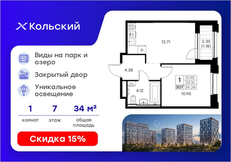 Продается 1-комн. квартира на 7-м этаже в проекте бизнес-класса GloraX Кольский. Общая площадь лота составляет 34,34 кв. м, из которых 10,95 кв. м отведено под жилую и 13,71 кв. м под кухонную зону. Номер квартиры - 307.