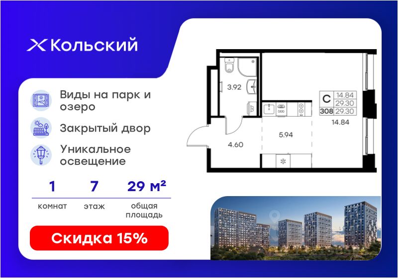 Продается квартира-студия на 7-м этаже в проекте бизнес-класса GloraX Кольский. Общая площадь лота составляет 29,30 кв. м, из которых 14,84 кв. м отведено под жилую и 5,94 кв. м под кухонную зону. Номер квартиры - 308.