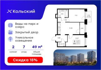 Продается 2-комн. квартира на 7-м этаже в проекте бизнес-класса GloraX Кольский. Общая площадь лота составляет 49,79 кв. м, из которых 21,49 кв. м отведено под жилую и 13,58 кв. м под кухонную зону. Номер квартиры - 656.