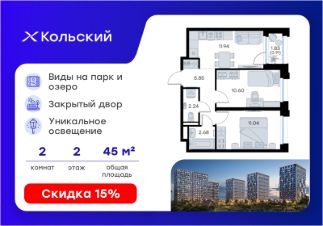 Продается 2-комн. квартира на 2-м этаже в проекте бизнес-класса GloraX Кольский. Общая площадь лота составляет 45,27 кв. м, из которых 21,64 кв. м отведено под жилую и 11,94 кв. м под кухонную зону. Номер квартиры - 1.
