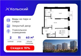 Продается 2-комн. квартира на 11-м этаже в проекте комфорт-класса Кольский. Общая площадь лота составляет 63,71 кв. м, из которых 27,62 кв. м отведено под жилую и 22,33 кв. м под кухонную зону. Номер квартиры - 235.