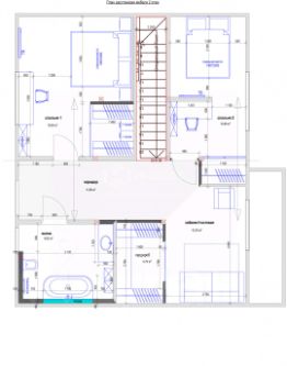 В доме 4 комнаты, кухня гостиная - 25 кв.м., два сан. узла (по одному-на каждом этаже). балкон с видом на реку, гардеробная, предполагается сауна и камин.