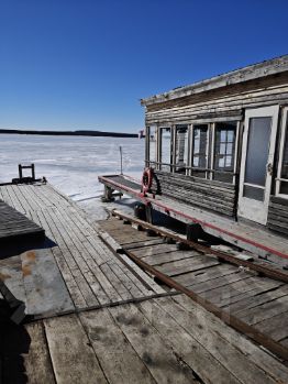 Укреплена береговая площадка под наклоном с рельсами (слип) для спуска лодки на воду.