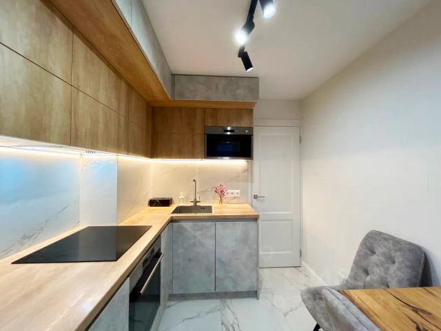 Это 2-х комнатная квартира 43 м2 с объединенной кухней и гостиной, отдельной спальней, кладовкой и совместным санузлом.