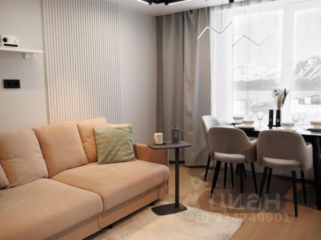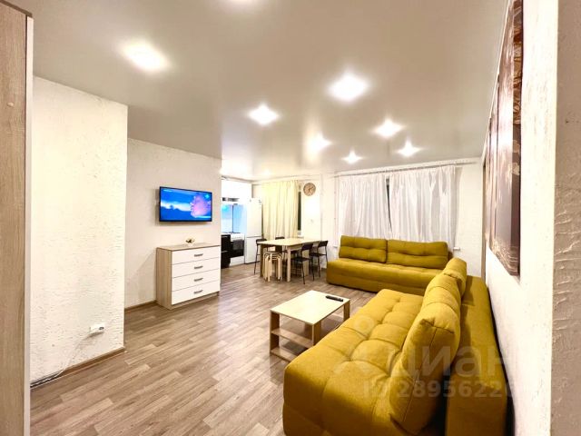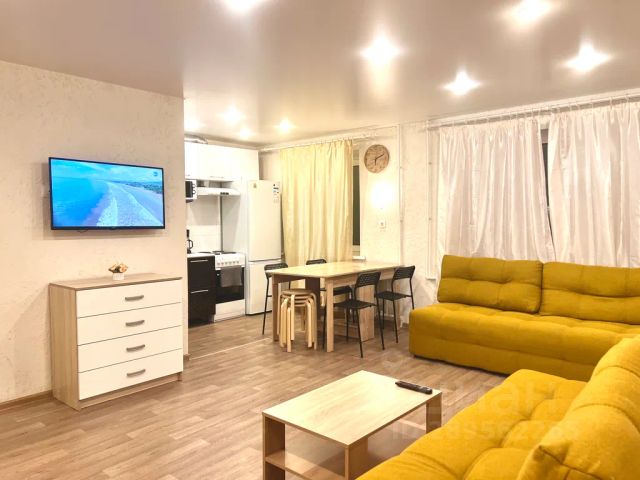 Стильная кухня-гостиная со всей необходимой техникой и раскладным диваном,