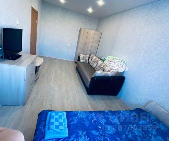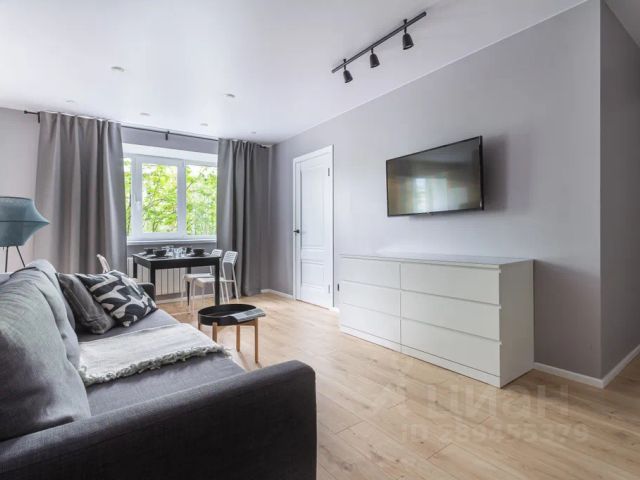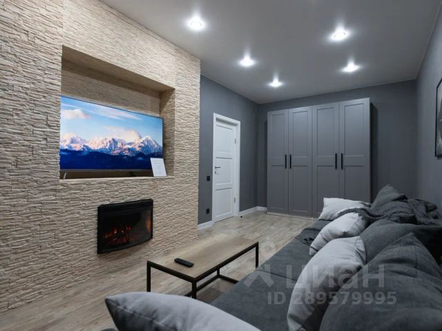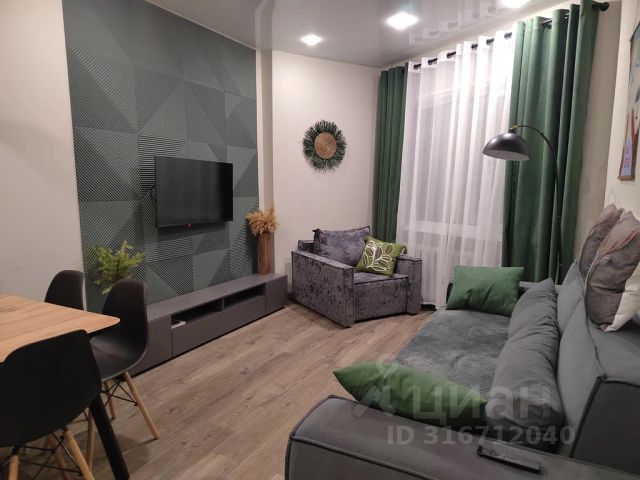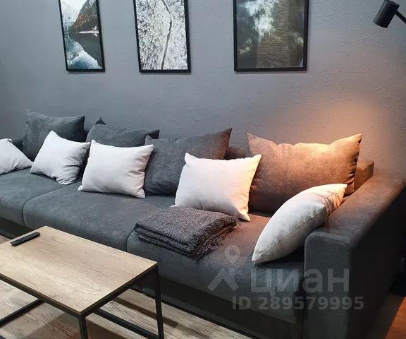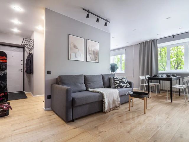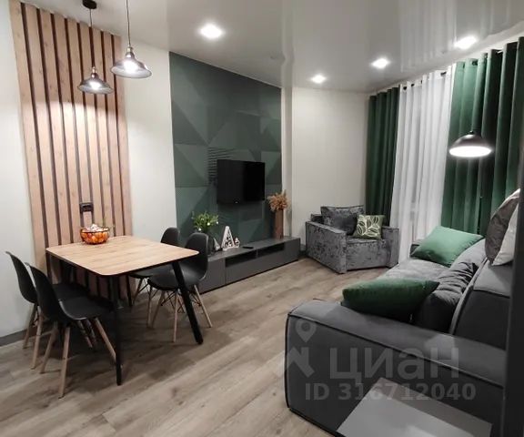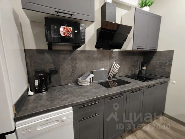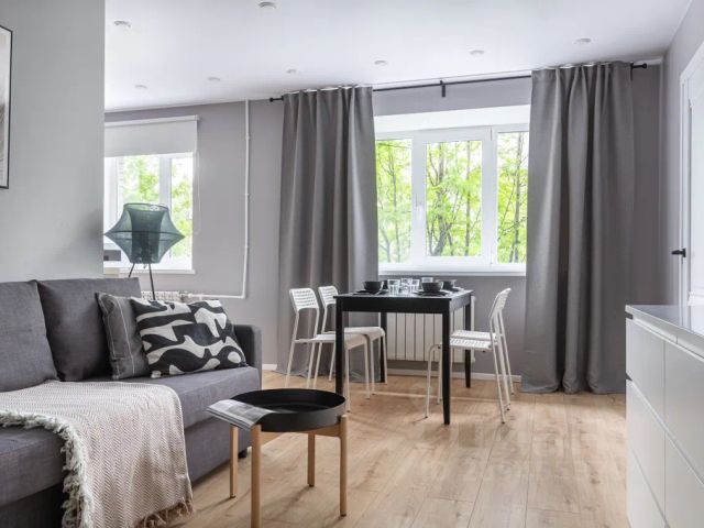 Стильная кухня-гостиная со всей необходимой техникой и раскладным диваном,